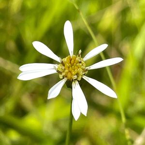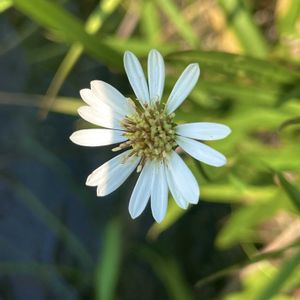 サワシロギク(沢白菊) キク科シオン属 花期:8〜10月の多年草 生育場所:陽当たりの良い酸性湿地 分布:本州、四国、九州 ・茎は細く、直立し、分枝が少ない 茎にはまばらに毛があるらしいが 手も届かない場所で見えませんで した ・葉は線状披針形 ・頭花は茎頂に散房状にまばらにつ き、直径2~3㎝。 ・舌状花は7~12個 ・花色は白色、しだいに淡紅色に変 わる特徴がある! GSで見せて頂いたサワシロギクは、白色から淡い紅色に変わることを教えて頂いていたので、この淡紅色の花を見つけて、サワシロギクだ❣️と大喜び🎶 間違いないですよね❣️ 📷 2025/10/17