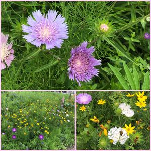 右上 スケトシア瑠璃菊 右下 半夏生 色が付いてきました❤ 左上 露草? 常盤露草と教えていただきました😊 左下 カラー