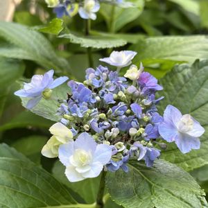 加茂セレ  おはよう🌸🌿( ⁰̷̴͈ ꇴ ⁰̷̴͈ )🎶  去年の父の日頃だったかに… プレゼント用の立派な鉢花がちょうど入荷したところに出くわした🤩🎶Lucky  真っ青な空の様な色に、フリルがかる八重の装飾花、一部発達した八重化する両性花✨  一見手毬咲きに見える額咲きのゴージャス💖な紫陽花  ( *ꈍ૩ꈍ)💘同じく一目惚れした、ありがとうと共にお迎えした  花終わりの頃、普通の園芸用土に鹿沼土を混ぜて植え付け、青色肥料で1年間育てた💙  当然青色で咲くことを前提に…  (๑¯ω¯๑)あれ?!  どう見ても…ピンク寄りの紫じゃね?!  いや…確実に紫色をしているじゃぁないか😳!!  しかも…装飾花が小っさい😑 去年とは打って変わって…貧相だ💦 まるで別品種…  う〰ん…肥料が足りなかったのか? 日当たりは…割とよく、葉焼けするほどに日が当たる場所だ。特等席に1年間鎮座してもらっている…  何故だろう?!  貧相だ…いや…視点を変えよう思考を変えよう🤔  楚々としたナチュラルさだ😂  紫陽花🔰1年生の私。。。  咲いてくれただけでもありがとう💖だ  紫陽花は奥深〜い  とてつもなく科学だ!  100億%サイエンスだ!🧐  やはり生産農家さんのプロの手には…到底届くことは無かろう🤣  本当に尊敬する(*´˘`*)♪  でもいつか…元々の空の様な青色を爆誕させたい😂😂😂…