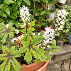株分けして 鉢と花壇に植え付けた ティアレア2種 葉脈が見えるのがスプリングシンフォニー 鮮やかなライム葉は シルベラート 線香花火のような繊細な小花がかわいらしい