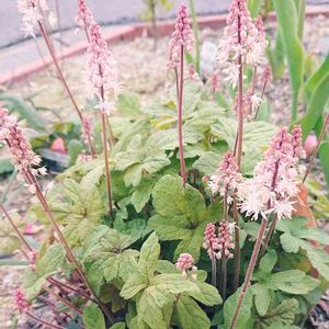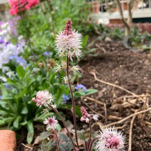 淡いピンク色が可愛い💕ティアレラ スプリングシンフォニー✨ オレガノがいなくなっちゃった所に植えたつもりが、暖かくなって左下から元気にワサワサ出てきた😂 みんな狭いけど頑張れー‼︎💦