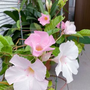 💗マンデビラ🤍 優しいピンクが咲き出しました💕💕 今年も樋に這わせて、長ーく楽しもうっと🥰🥰🥰