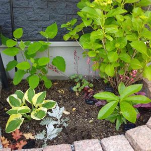 配置バランスが、 どうしたらいいのかわからない。 ヒューケラは結局のところ一番手前がいいのかな? アジサイの足元がいいのかな?
