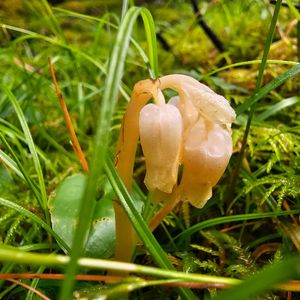 シャクジョウソウ(錫杖草) *ツツジ科シャクジョウソウ属 【・新エングラー体系→イチヤクソウ科 ・クロンキスト体系→シャクジョウソウ科 ・APG体系→ツツジ科に分類に至る】 花期は6〜8月 北海道〜九州の山地のやや暗い場所にに生育する。 菌従属栄養植物で全体が淡黄褐色! 高さは10〜20cm 茎には葉が退化した鱗片葉が互生する! 茎頂に5〜10個の花を下向きに付け、次第に上を向いて果実は ほぼ真上となり蒴果となる! 和名は修行僧が携帯する杖の錫杖に似ている事から❗️ 仙台市秋保大滝付近 6月29日撮影