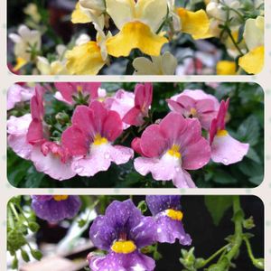 軒下組みのネメシアをなんとか📸 雨が強いので水滴付いてます𓂃 𓈒𓏸 ネメシアは雨にめっぽう弱いので軒下が特等席です😅 3色とも皆お顔が違うのが面白いです(ちなみに3つともハルディンさん)