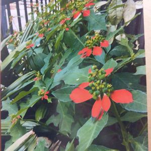 今日のお花♪のポインセチア持ってませんが‥ 庭のサマーポインセチアがずっと元気で涼しくなった今沢山の茎に花を付けて賑わせてくれています🎵🎶 朱赤色に色付いた部分は葉っぱで茎の先に緑黄色の鐘形の花序が花です。 小さな小さな花が密集しています🤗 花言葉『祝福』 葉の赤い色が目立つ草花でこのようなおめでたい花言葉が付けられたかもと書かれていました。