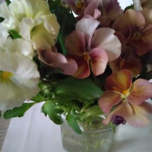 picNo.1896 ひと月半振りに植物の手入れをして投稿を何枚もして様子を見て戴いて ありがとうございます<(_ _)> 1⃣まだまだキレイな可愛いビオラなごみももか しんしんとクラッピングの花を✂️でカット室内で飾って眺めます😌 2⃣クラッピングのパンジー 3⃣ウィンターコスモスが開花始まりました&蔓ニチニチソウが勢力向上し、花数が例年よりもありそう 4⃣変わり咲きビオラ ラベンダーマジック 5⃣4/26(土)夕方に三人の孫の夜御飯にと義娘に頼まれ買い出しに行き届けた🍕出費が新札のあの方直ぐに財布から無くなる 夫が散歩で行って北海道物産展の白い恋人たちと期間限定品の菓子 余談 BS春のにっぽん縦断こころ旅番組 田中美佐子さんだけど、GW期間中で今週は休み 火野正平さんの懐かしい数年前の撮影を再び放送 昼12:30からは朝ドラ再放送とアンコール放送が重なり見るのを迷いBSを見て後から+を視聴。 今日はアンコール放送のカムカムが明日で終わるので、こちらを見ました🤗 今日は23年6月に火野正平さんが訪れた石川県は景色は凄く良くて まさか、翌年正月、元日に大地震が発生するなんて 今その場所がどうなってるか、とても気になります 一日も早く前に進むのと、笑顔が皆さんに戻りますように 園芸記録 サクラソウグリーンライムが乾燥状態で活き活きさ失う ピンク色のサクラソウは消えていた 菊の苗木が背丈延び成長 ネモフィラが元気よい訳 活力剤を挿していたから、だった
