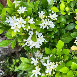和の庭でゲッキツの花が満開です。 月夜に柑橘の香りを強く発することから、ゲッキツ(月橘)と呼ばれるようになったとか🤔 沖縄では、"ギキチャー"の方言名で親しまれ、自然に自生してたり、生垣等に使われていたり結構ポピュラーな植物です。 しかし...GSしてなかったら、この子の可愛さも爽やかな香りも気付くことはなかったかもです😅💦 GSに感謝感謝😊 水撒きの時にジャスミンに似た爽やかな香りが漂って