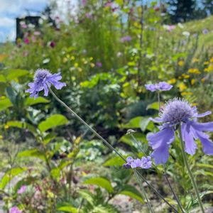 《スカビオサ和名はマツムシソウ》 高原のお花畑を彩るさわやかな花で、昆虫のマツムシが鳴くころに咲くのでこの名がつけられています🤗🌸 ユニークな花形とソフトな色合いが魅力で、風に揺れて群れ咲く様子には、自然な風情が感じられます😊 古くから俳句にも詠まれ、秋の季語ともなっています。小花が集まって大きな頭状花を形づくり、外側の花弁が大きく広がるのが特徴です🤗🌸🌼
