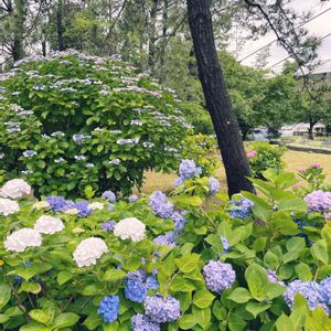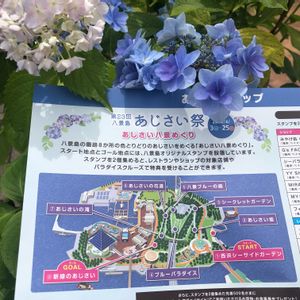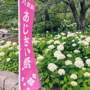 紫陽花 八景島で鑑賞できる紫陽花について 八景島にはガクアジサイ (18,000株)、 セイヨウアジサイ (2,000株) が植えられています。 これら のアジサイは平成5年の八景島オープンに合わせて植えられたもので、近年梅雨どきに見事な花を咲か せるようになりました。 ガクアジサイ セイヨウアジサイ ユキノシタ科に属する落葉低木です。 高さは2m前後に なり、 葉は光沢ある広卵形、 原質の明緑色をしています。 花は6月頃に咲き、枝先の中央に小形の両性花を多数つけ、 その外周に形の装飾花 (中性花)をつけています。 色は 淡紅色、淡青紫色、紫色、まれに白色があります。 房総半島、 三浦半島、 伊豆諸島など暖地の海岸沿いの山地に生えて います。 日本産のアジサイが18世紀末にヨーロッパへ持ち込まれ て品種改良され、 日本に逆輸入されたものを総称して言い ます。 現在では数百種にもなります。 アジサイの花の色というのは土壌が酸性では青色、 アルカリ性では紅色になります。 また土壌に含まれる肥料の差異 によっても変化し、窒素が少ないと紅色が藤色に、 窒素が 多くカリが少ないときは紅色が強くなり、 カリが多いと 青色が強くなります。 ✼••┈┈┈┈┈┈┈••✼ こちらは、白いアナベルの大滝…と言う所で〜満開時は、見事なんですよ~♡ 満開は、まだもう少し先の様です… 程良く歩ける広〜い園内は、入園無料。 素敵なあじさいが沢山咲いていました𓂃 𓈒𓏸𑁍テクテク…