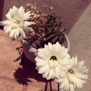 『エキノプシス属エイリエシィ短毛丸 』 アルゼンチン、ウルグアイ、ブラジル原産の球サボテン!水を好み丈夫でよく子ができ群生する。寒さに強く花は白の大輪で甘く良い香りがする。 夜に開花し朝にはしぼむ1日花だが曇りの日などの時には数日咲いていることもあり花はロウト状で花茎は20cm程にもなる。この姿からテッポウユリサボテンとも呼ばれる。短毛丸の名のとおり非常に短く鋭いトゲを持ち ウニサボテンとも呼ばれるみたい。