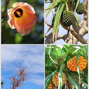 週末の散歩コース🚶♀️ 先週末は、台風8号接近で来れず 2週間振りのセカンドハウス🏠 散歩コースで出会った花や実が 色ずいてました。 ↖️16:06分のユウナの花は オレンジ色でした🧡 ユウナの花は午前中は黄色💛から 午後にはオレンジ色🧡に 変化します。 ↙️青空映えのドラセナ ↗️タコノキの実 ↘️アダンの実