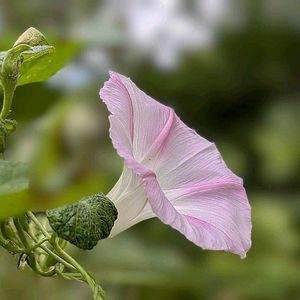 こんにちは☁ 今朝はピンクの朝顔が咲きました あとから発芽した小株には 紫の大輪朝顔の蕾かもしれません 楽しみな赤ちゃん蕾も出来ていました