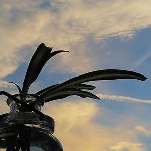 台風の被害にあわれた方々へお見舞い申し上げます 空の色や雲の形に季節の歩みを感じます 柔らかに流れるような波打つような夕焼け雲と水栽培のオリヅルラン
