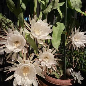 おはようこざいます🌤 今日も熱中症アラート発令されました。 水分補給します。 🍀月下美人 昨夜10時、第二段七個が開花しました。 一度に咲くと一段と豪華絢爛です。 後ろに二個咲いてます。 楽しませてくれてありがとう💕💕 🍀朧月 月下美人に圧倒されてます😅 今日も無理せず、早めのエアコンですね❗️