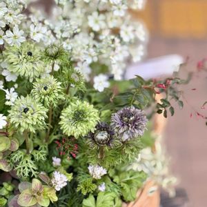 穏やかで美しい 初雪の風景のよう𓂃𓂂𖡼.𖤣𖥧𓈒❄︎ 妹からの 冬の贈りもの⋆* とっても優しい ハーフリースです 幾重にも重なった 花弁の美しい白薔薇 薄く灰色がかった 紫灰色のモーブカラーの葉 野草の多くは 実際にはモーブ色であるとか.. 自然の大らかさも 感じさせてくれますね*。゚ このグリーンの色々ったら うっとりします 大好きだわ~ 笑🌿 ドアップで✴︎ 大切な人との幸せを 花でつなげる・・ 素敵なメッセージつき✐☡ 思えば ことある毎に 花を贈ってくれます 目にする度に その時の思いを感じて メッセージと共に 暖かな気持ちになります𖧷 花の贈りもの いいですね 𓂃𓋜⋆ฺ。*
