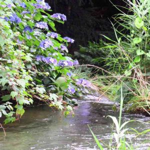川にせり出すように咲くガクアジサイ。会津ではまだまだアジサイ満開でした〜🎵 やはり神奈川とは季節が少し違うのかな。