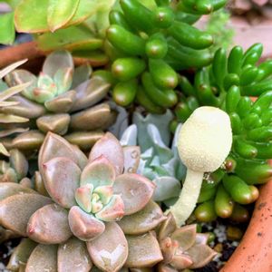 ギョエ〜(´⊙ω⊙`) 雨ざらしの多肉に巨大キノコ🍄発見 許せません❗️ まわりの多肉が黄色い粉まみれになってました。撤去 撤去