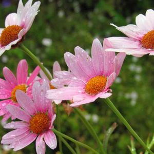 ピンクのマーガレット。雲の間から僅かに射す陽の方を向いているように見えました🍀 雫💧がキレイです
