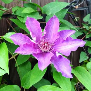 雨が降り続いています☔☔☔ クレマチス ザ・プレジデント** 咲き始めました⤴️⤴️ 3号ポット苗で購入して4年目ですが… あまり陽が当たらないので、なかなか咲かないよう😅 《品種説明》 ラヌギノーサ系クレマチス 開花時期 : 5月上旬 - 2・3回 花径 : 15-18cm 弁数 : 6-8枚 草丈 : 1.5-2.0 新旧両枝咲き 弱剪定 青紫色の大輪剣弁花。 花の発色のよい濃い紫色で力強い色合い シャープな剣弁で重なりがよくやや波打つように咲き姿に立体感があり動きが感じられる。