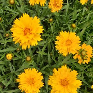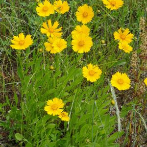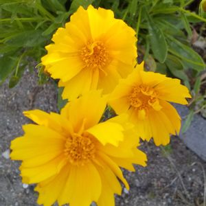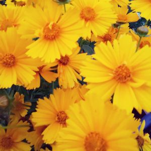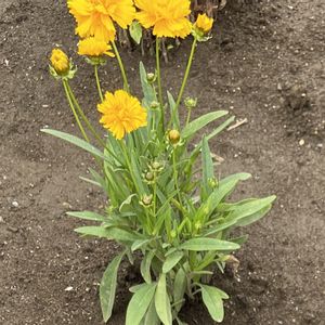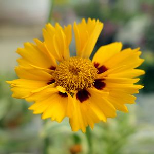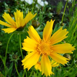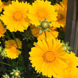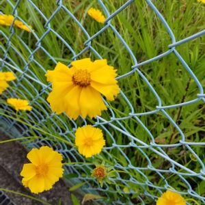【コレオプシス(キンケイギク・金鶏菊)】 南・北アメリカ原産、キク科多年草 長く伸びた細い茎の頂部に、花径2~7㎝程度の頭状花を一輪咲かせる。 頭状花は、中心部分の筒状花と周囲の舌状花から形成されており、花姿はコスモスに似ている。 草丈:0.2~1m、 開花期:5月~10月 花色:黄,ピンク,赤,オレンジ,複色 ガーデンマルシェ防府