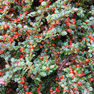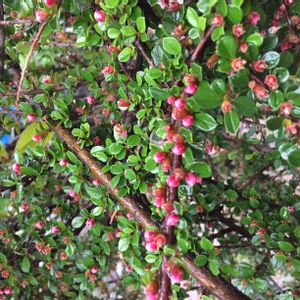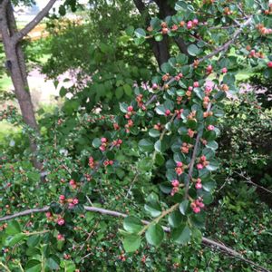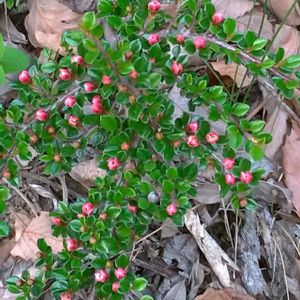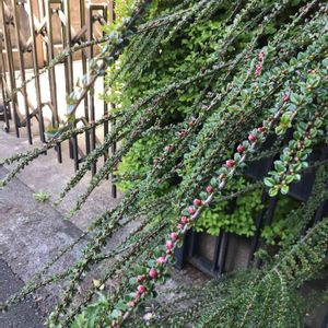 ベニシタン🔴 バラ科シャリントウ(コトネアスター)属の常緑低木🌳花弁は平開せず、この状態で満開💕 真っ赤な粒花🔴超キュートです(´▽`)ノ 枝は立ち上がらずに水平に伸びていきます🌱 山野に雪が積もり野鳥の餌が乏しくなると、ベニシタンの実が好物の野鳥達が食べにくるそうです💓