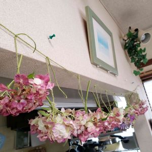 アジサイのガーランド アジサイもそろそろ終わり‼️ 来年のためにカット✂️ これは「天使のほっぺ」。 真っ白からピンクに色変わりするアジサイです。 キッチンのガーランドにして お料理する時にテンション上げます~👍 あと残るは アナベルとマジカルレボリューションのみ。 マジカルさんの隣にちょこんと絞りの朝顔が~🎶 可愛すぎ~💙