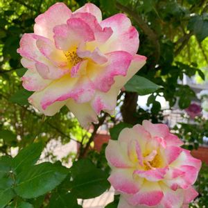 色変わりが楽しめる薔薇 キスオブフロリア 咲きはじめの黄色〜咲き終わりに近づくと 黄色が白く抜けて先端のピンクが 濃く色づく魅力がある薔薇です