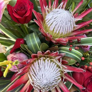 おはようございます♪ 散歩道の開店祝い花💐 ワンプレートのランチのお店みたい ❤️キングプロテア❤️ ヤマモガシ科 常緑低木