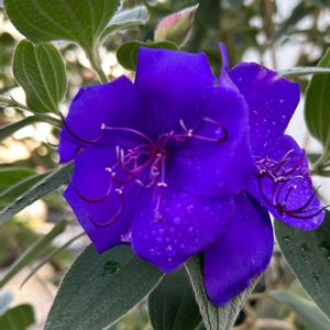 おはようございます♪ ♡今日のお花♡ 💜紫紺野牡丹(シコンノボタン)💜 ノボタン科ティボウキナ属(シコンノボタン属) 開花期9〜11月 常緑低木 💜紫色の花で、シベも紫色をしています シベが🕷️蜘蛛の足のように見える事から、スパイダーフラワーと言われているようです 🍃葉は対生し産毛で覆われています