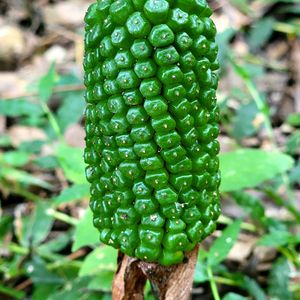 ディズニーシー アメリカンウォーターフロント ハイタイド・トリート近辺 「ウラシマソウ」の実 緑の🌽〜 周りの🌿は ユキノシタ🌿かしらねぇ ウラシマソウの🌿は 見当たらず💦💦 今年はお花は 見れませんでしたぁ💦 7月8日 撮影