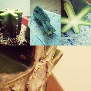 お水をあげてもシワシワのままなので 根っこが木質化してるのかと思い 掘り起こして茶色い根っこをカッターで切り開いたら 中から白い根っこが出て来ました。 ついでに脱皮途中の皮も取っちゃいました。 浅めに植えてお水をたっぷりあげてみたけど ちゃんと復活してくれるかなぁ…(´・ω・`;)