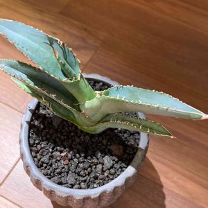 アガベ チタノタ斑入り 新しい葉は斑入り 古い葉はあお 前は斑が入ってたのになー 季節斑?とも違うのかな