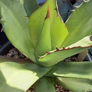 アガベ、チタノタ・ブラック&ブルー…なんだけど、ブルーはともかく棘はブラックじゃないよなー。通常より幅広葉タイプ。ただし、我が家ではサバイバル状態なので、ちょっと葉が縮んだような気がしないでもない。ちょっと皺というか溝が目立ってきた。