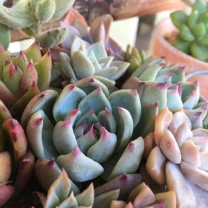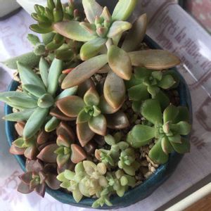 簡易温室の中にいる、横長の寄せ植え🌵 クリスタータスセイヘリーの黄緑色とピンクの桜吹雪さん🌸 気に入っている寄せ植えの1つです💝