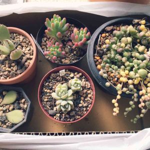 多肉まつりで連れてきた子☺︎ 欲しかったテディベア、帝玉、黄麗錦、子猫の爪、チワワエンシス、七福神♪ と右下の名前なし…なんだろうこれ? お店の人は帝玉かもって言ってたけど…本当? 明日も行こう‼️もっとお金持ってこう…(笑)