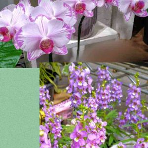 お花屋さんの白にピンクのミニ胡蝶蘭と紫色のアンゲロニア サリカリーフォリアの花、とても綺麗です💕