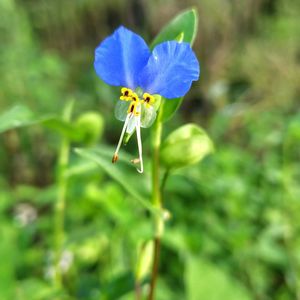 ◎ツユクサ(露草) {×ムラサキツユクサ(紫露草)←訂正します🙇♀️} 朝の庭を歩いたら(イヤ、歩くというより、出るが正しい!(˶ฅωฅ˵))、 釣り下げ鉢から、青い蝶々🦋が飛び立とうとしてる?‥のではなく、 植えた覚えのないツユクサさん一輪💙 前の棲み人去りぬの空き家🪴(^_^;) もしも、ツユクサさんが気に入ってくれるなら、このまま棲み家にして家族を増やして欲しいと思った朝でした🙏 (お家賃無料、朝晩のお飲み物、時々お食事サービスしますby 大家)
