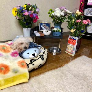 3/11 ワンワン祭りに参加しまーす お出掛け先のお花と 我が家のゼラニウムと一緒に 愛犬シャンプーしたので 裸坊です。笑