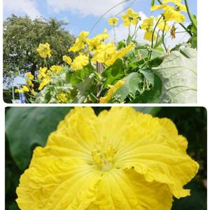 そろそろ秋、、、て時になってようやくヘチマの花が咲き始めました😆 葉だけがジャングルの様に繁り、全く咲かないので、もう処分しようとした矢先。 涼しくなってやっと思い出した様に💓 ちゃんと実になるかが課題☝️ 向かって左側ヘチマの花 右側はゴーヤの花