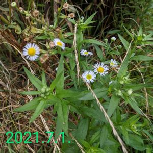 さ〜て、以前から蕾の名前を尋ねていましたが…。 今日、咲いていました。 姫女苑 (ヒメジョオン) と言う事でした。 駐車場側の花壇にて 2021年6月28日撮影。