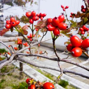 鮮やかな深紅のピラカンサの実 20181019鳥羽市にて。 海辺の道を散策中,ホテルかな?へのアプローチの道路で真っ赤な美しい実を沢山付けた木を見ました。葉っぱの形がナンテンと違う,ピラカンサと言う様です。