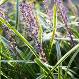 花壇のヤブランが綺麗でした。20181028 名古屋栄オアシス21にて。 半地下の空間でいろいろな花が花壇で咲いていました。ヤブランが紫の花を風になびかせていました。