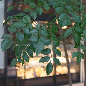 スイーツ喫茶前のシマトネリコの鉢植え。20181028名古屋栄オアシス21にて。 奥のショーウィンドーには,楽しそうで美味しそうなスイーツが並んでいます。始めはコーヒーの木かな,それならうってつけと思って撮りましたが。調べて見て,シマトネリコではないかと思います。