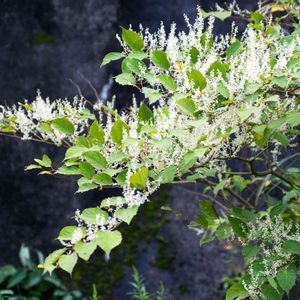 白い花を沢山咲かせたイタドリの木 津市安濃ダムの公園で見た白い樹の花。イタドリだと思います。葉っぱが互性でカクカクと枝が曲がりながら伸びていて,細かい小さい花が咲いていました。