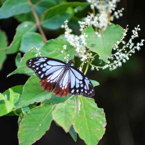 イタドリの花を訪れたアサギマダラ 木の白い花を撮っていると,すーっと大きな蝶々が止まりました。アサギマダラです。この蝶が私は大好きです。上質なステンドグラスの様な透き通った羽が大変魅力的です。嬉しい出会いでした。