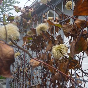 クレマチスのモシャモシャの実 丸いボアボアの毛糸が付いているような,クレマチスの実です。この綿毛がひとつひとつ飛び散って子孫を増やしていくのでしょう。