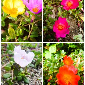 花壇の色とりどりのポーチュラカ 訪問先の街の駅までバスを待つ間に駅の周りの花壇で色とりどりのカワイイ花を見ました。横に広がってから周りで咲く変わった感じでした。しらべてポーチュラカと判りました。