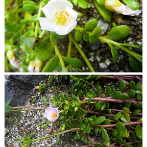 白いポーチュラカの咲く株の写真です。 横向きに円形に広がって,周辺で花が咲きます。茎はピンク色,葉っぱは結構肉厚で,今回初めて見た(認識した)のですが,しっかり記憶にのこりました。