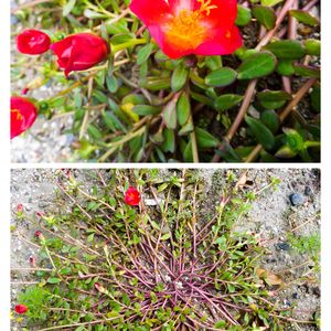 赤いポーチュラカの株を上から撮りました。 中心から,まず真横に円形に広がって,周辺部で花を咲かせます。大変面白い生え方です。はじめて見ましたが,これは特徴があるなあ,と記憶に残りました 。